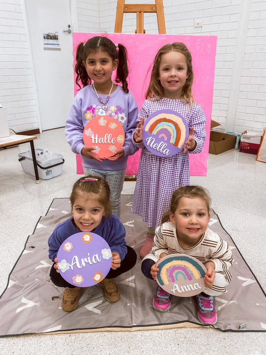 Painting brings me to my happy place, so naturally I paint things that make me happy. And now I get to share this with all of the children lucky enough to attend one of my workshops. The worst enemy to creativity is self-doubt so my goal during my workshops is to encourage confidence and to create a space free of judgement so that every child has the ability to follow their imaginations wholeheartedly. And what better way to give these kids a sense of ownership, by making their very own door sign, to be admired everyday by those who are lucky enough to see it.